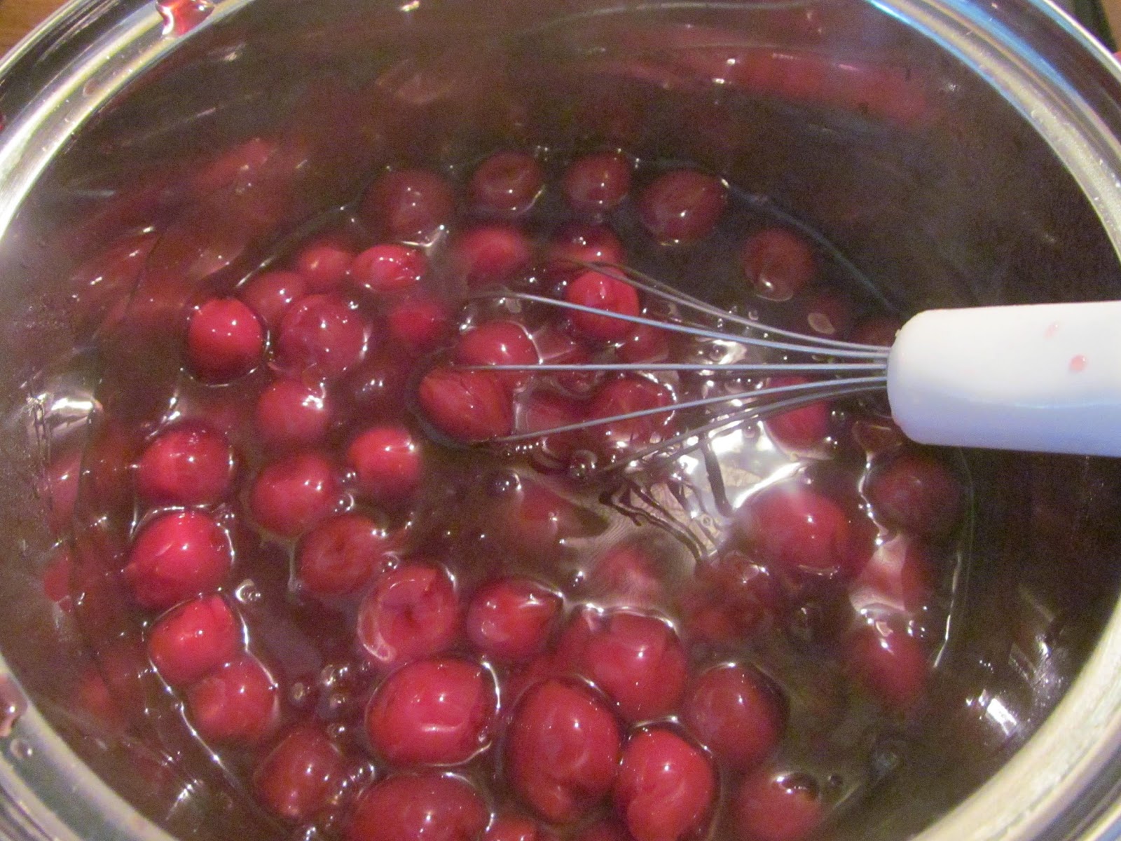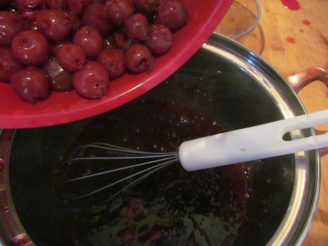 • Черешовият сос също трябва да е предварително приготвен и да се поддържа топъл. За целта – прецеждам черешите, а сокът го слагам в подходяща тенджерка на котлона да заври. Ако е нужно подслаждам със захар. Добавям и ванилията.