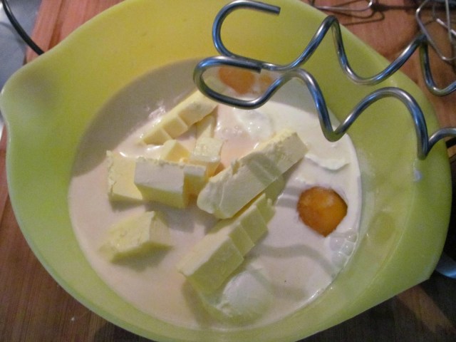 • Всички продукти за тестото се изсипват в купата на миксера. Поради това, че маслото е нарязано на кубчета, започвам разбиването с накрайниците за тесто, докато се поразбият бучките масло.