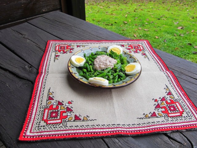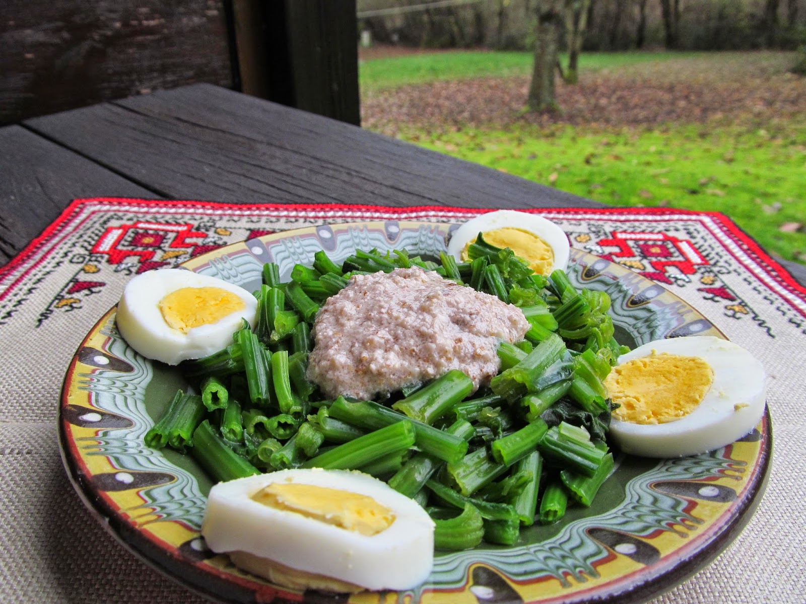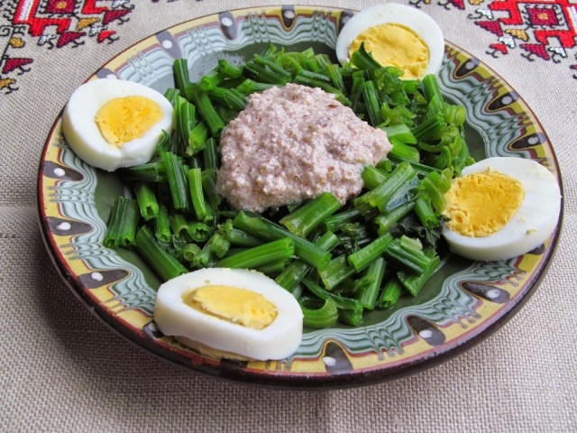 - Изсипвам спаначените коренчета в чинията за сервиране, заливам с ореховия сос и аранжирам с филийки от твърдо сварените яйца.