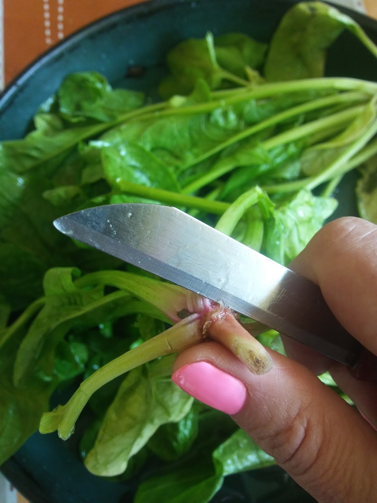 - Кореновата част на спаначените коренчета отрязвам до където започват стеблата на спанака.