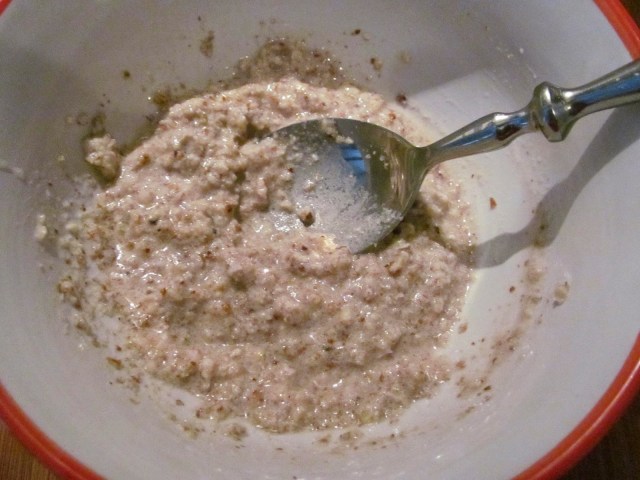 - Получилото се орехово пюре, размесвам с горещата вода, до получаването на гъста кашичка.