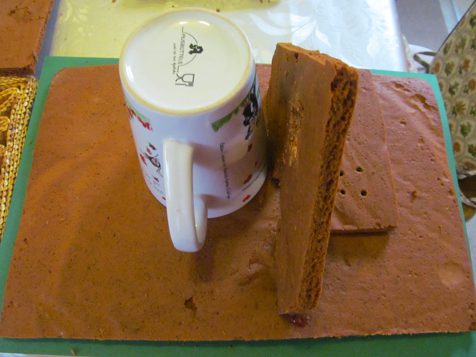 - За да може да стоят прави стените на къщичката, използвам обърната чаена чаша, която ги подпира. Но залепването с карамел е много бързо и почти не е нужно да се използва чаша. Залепването със захарното лепило се нуждае отмалко повече време и чашата е много важна.