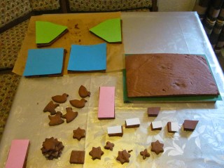 - След като и втората кора е изпечена, предвиждам първо основата на къщичката, която е правоъгълник с размер 33х20 см. Върху тази основа изграждам къщичката и декорирам дворче пред къщичката.