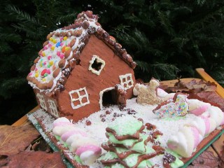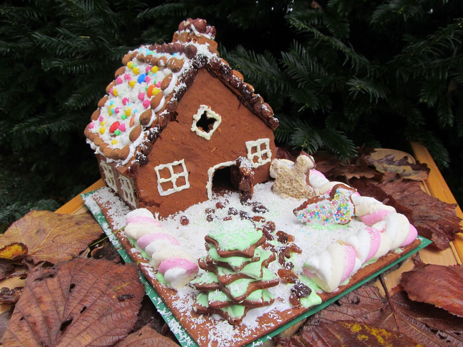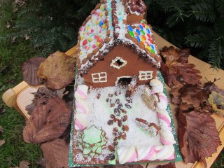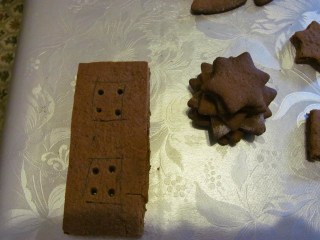 - За допълнителна декорация на къщата се използват различни формички за сладки, с които разполагате. Децата се радват много на формички за различни животинки, които може да се разположат около къщата. Аз използвах форми звездички, за да импровизирам и елхичка.