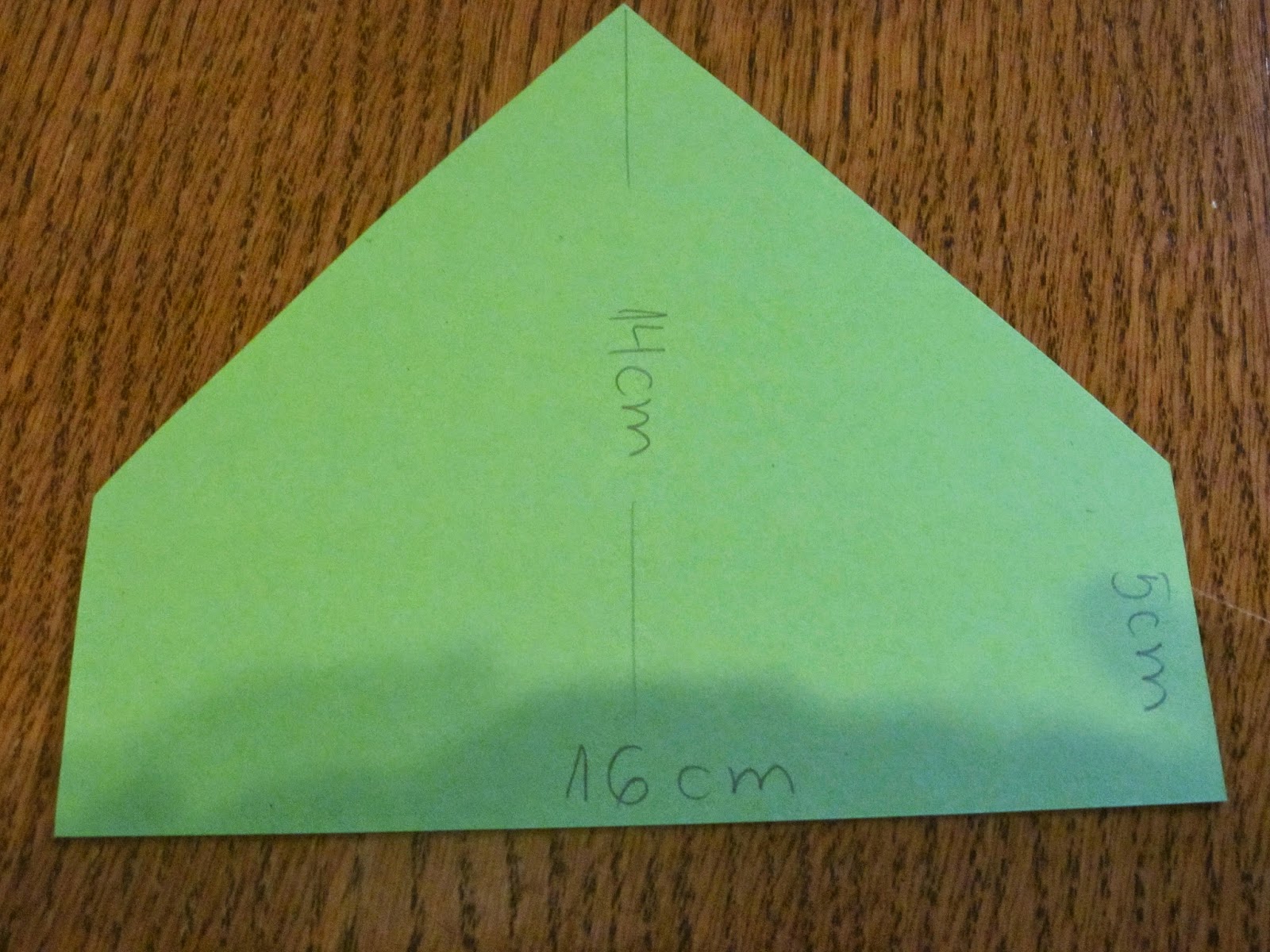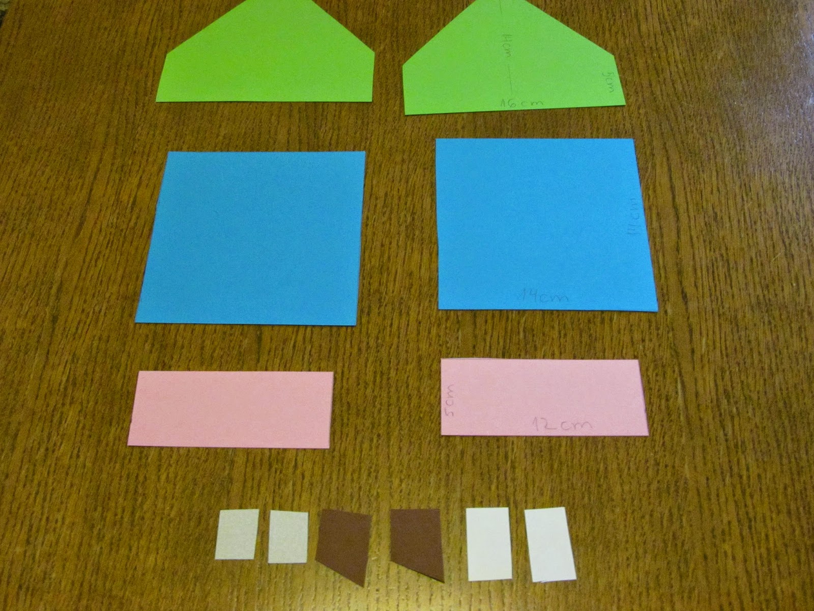 - Два петоъгълни шаблона с размери 16х5х12 см. Като разстоянието от основата до върха е 14 см. Това са предната и задната стени на къщата.