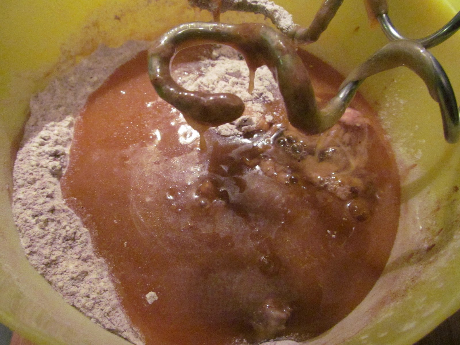 - Изсипвам поизстиналата медена смес и разбивам с миксера, с накрайниците за тесто.