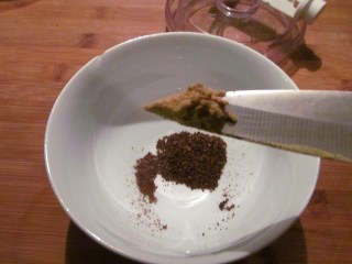 - Изсипах пресятите карамфил и бахар в купичката и добавих от всички останали подправки, количество колкото да се събере на върха на ножа.