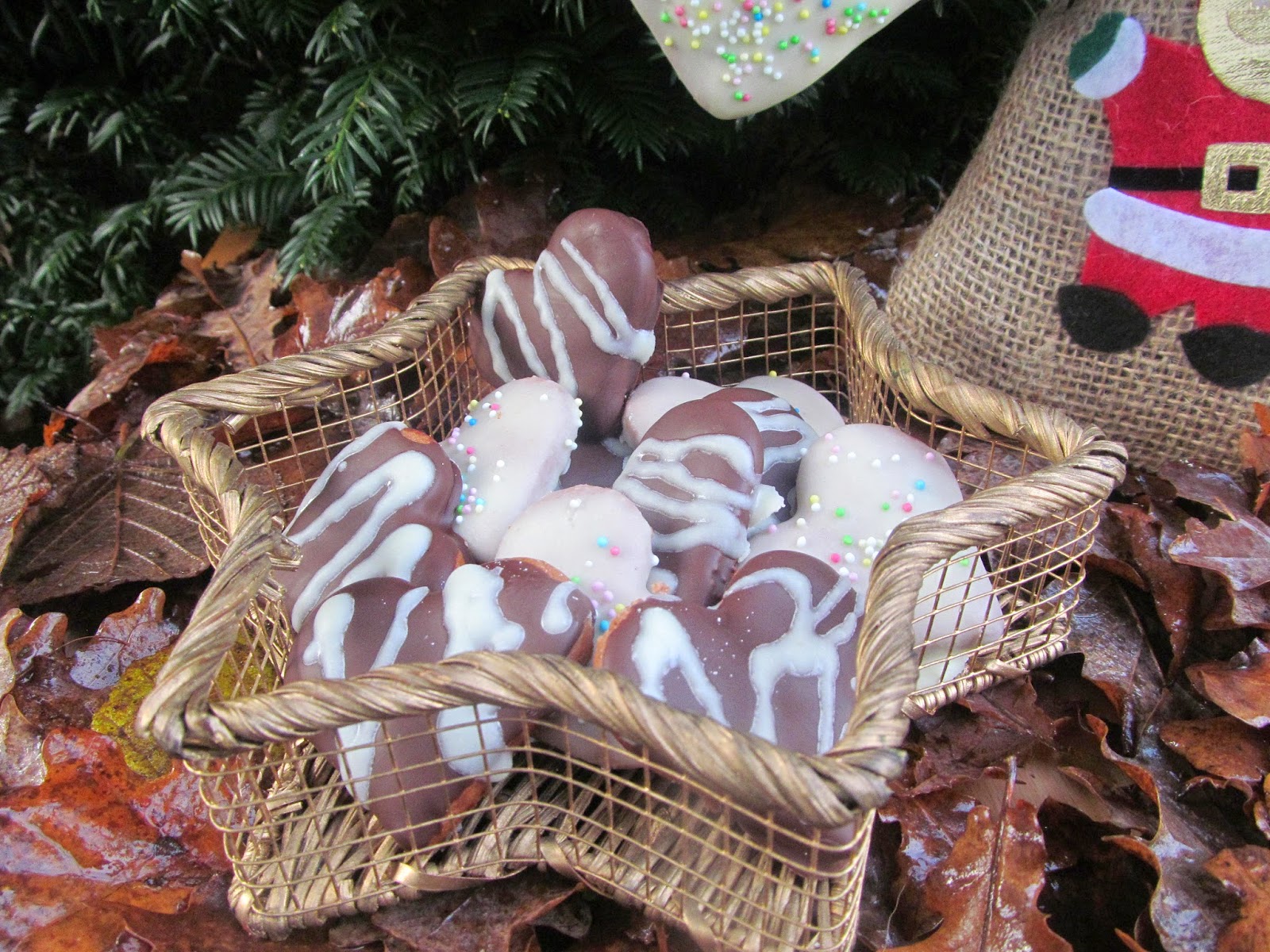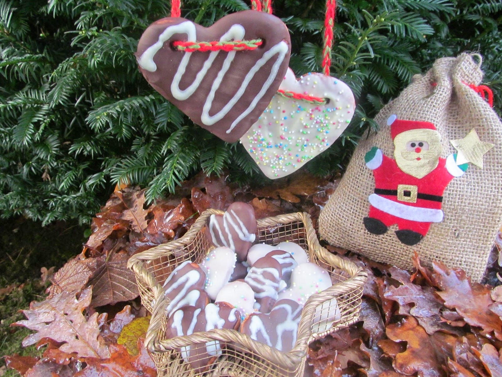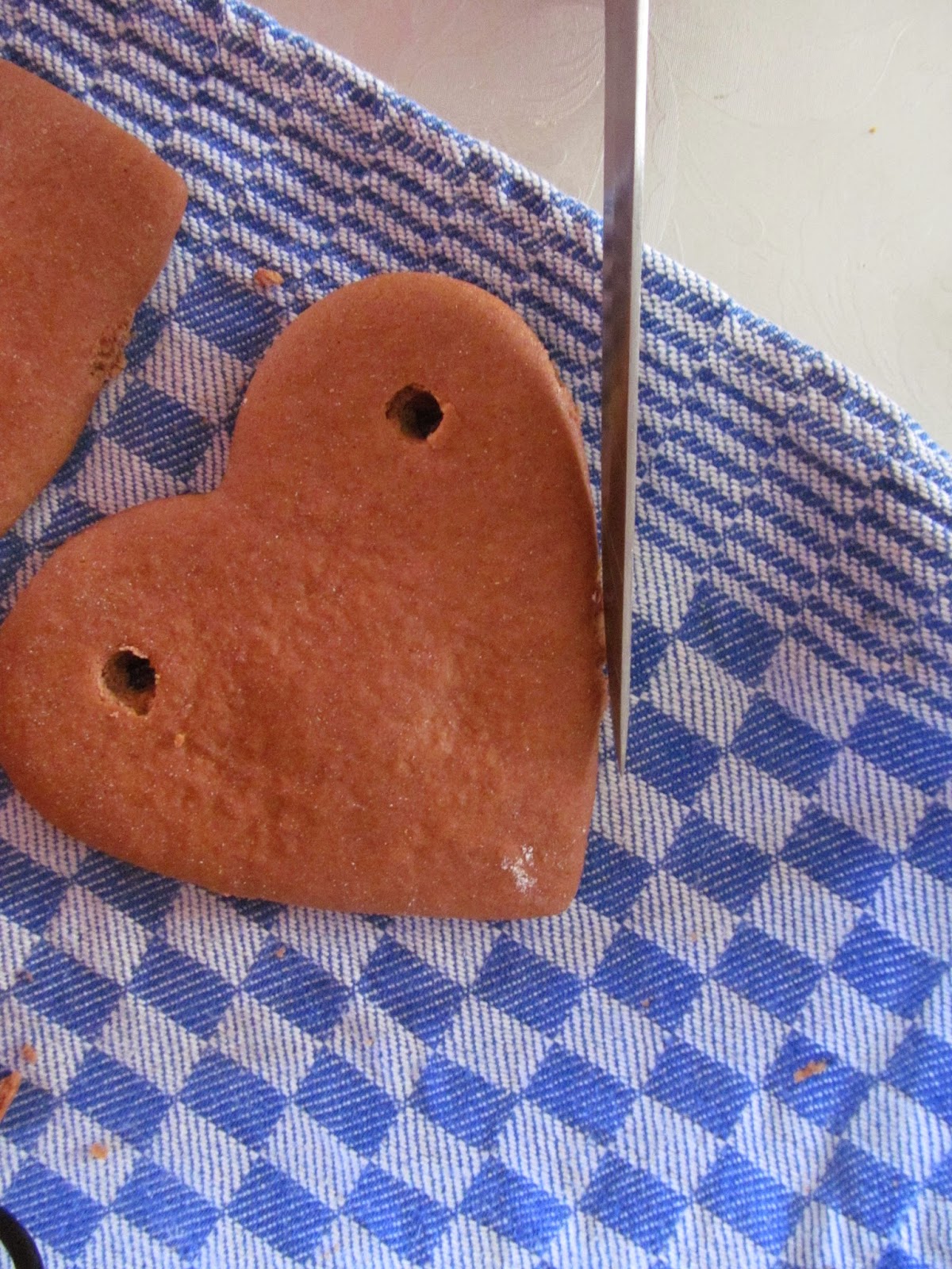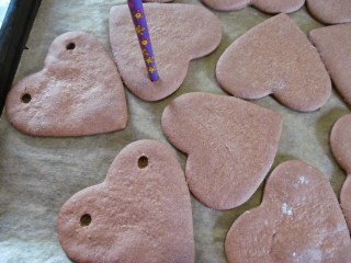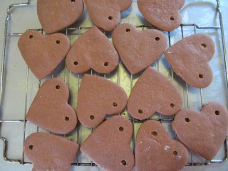 - Много е важно, ако ще правите украшения за елхата, или пък искате да подарите от сърцата на някой и ще им сложите панделка или някаква друга подходяща връзка, още докато са горещи да пробиете дупчиците с молив, защото после те стават твърди и това е невъзможно. Моите връзки изплетох сама на една кука от два цвята – червен и зелен /цветовете на Коледата/.