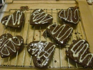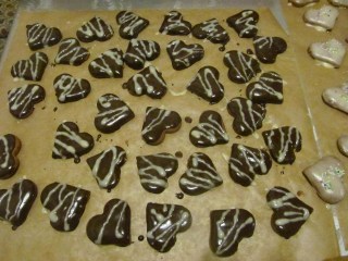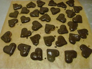 - Потапям лицевата страна на половината от сърчицата в черния кувертюр и ги оставям върху решетката или направо върху хартия за печене. Все пак внимавайте шоколадовата глазура да не е гореща, защото аз работя с ръцете – не използвам никакви прибори.