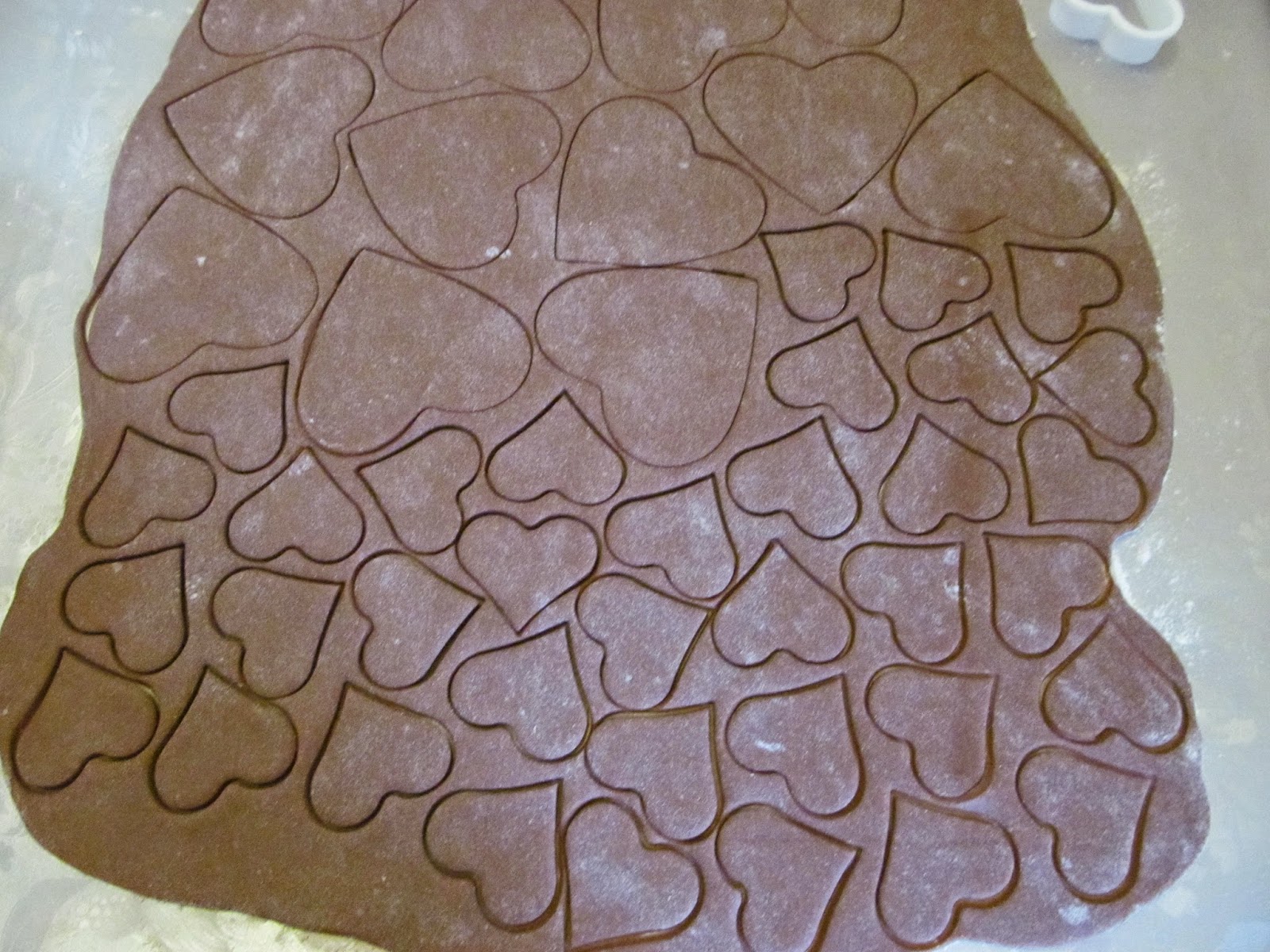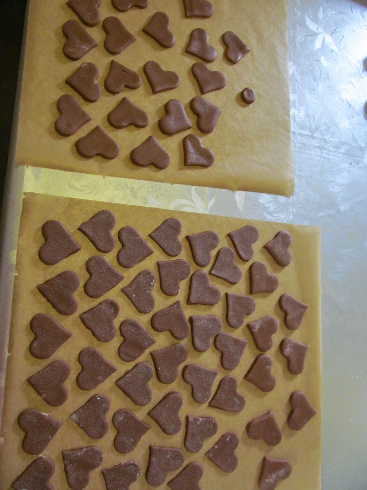 - Изрязвате сърцата, с помощта на формички за сладки. Аз използвах голям размер от 8 см и малък размер от 4 см. Получих 14 големи сърца и 66 малки.