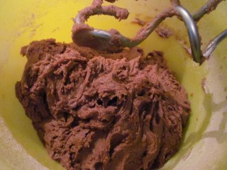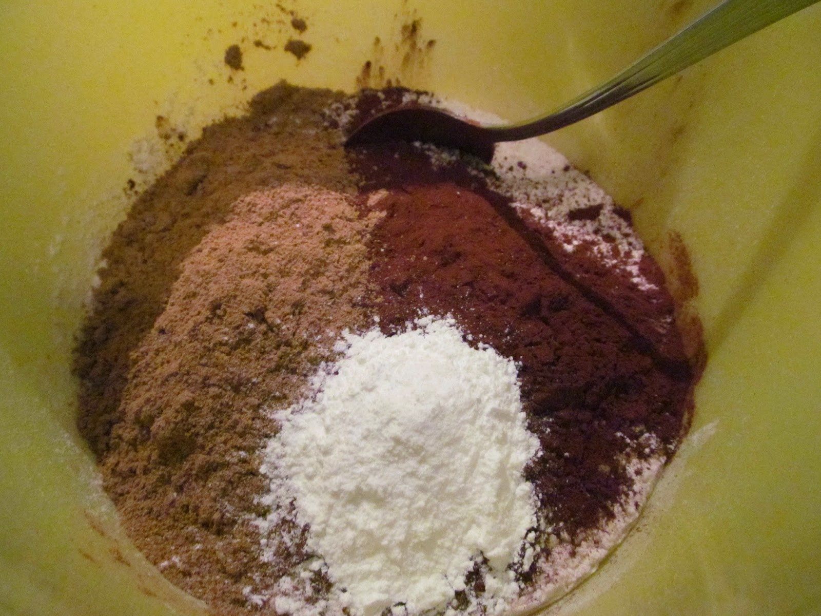 - През това време, в купата на миксера, изсипвам брашното, какаото, подправката и бакпулвера. Разбърквам добре, за да се смесят всички съставки.