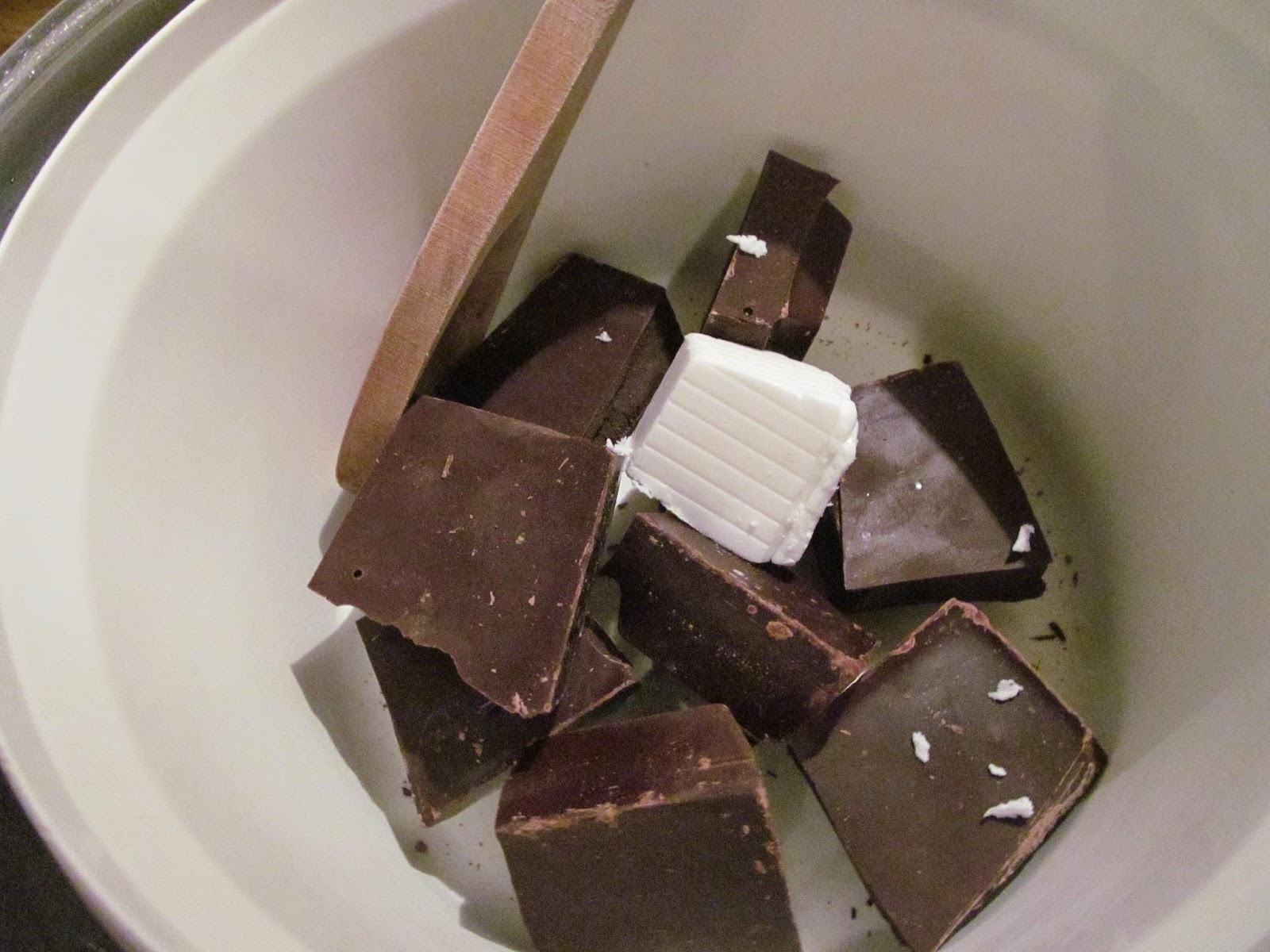 - През това време разтопявам на водна баня тъмния кувертюр, заедно с 50 гр. палмово масло. При водната баня не забравяйте – водата не бива да завира!