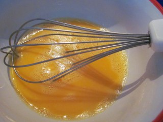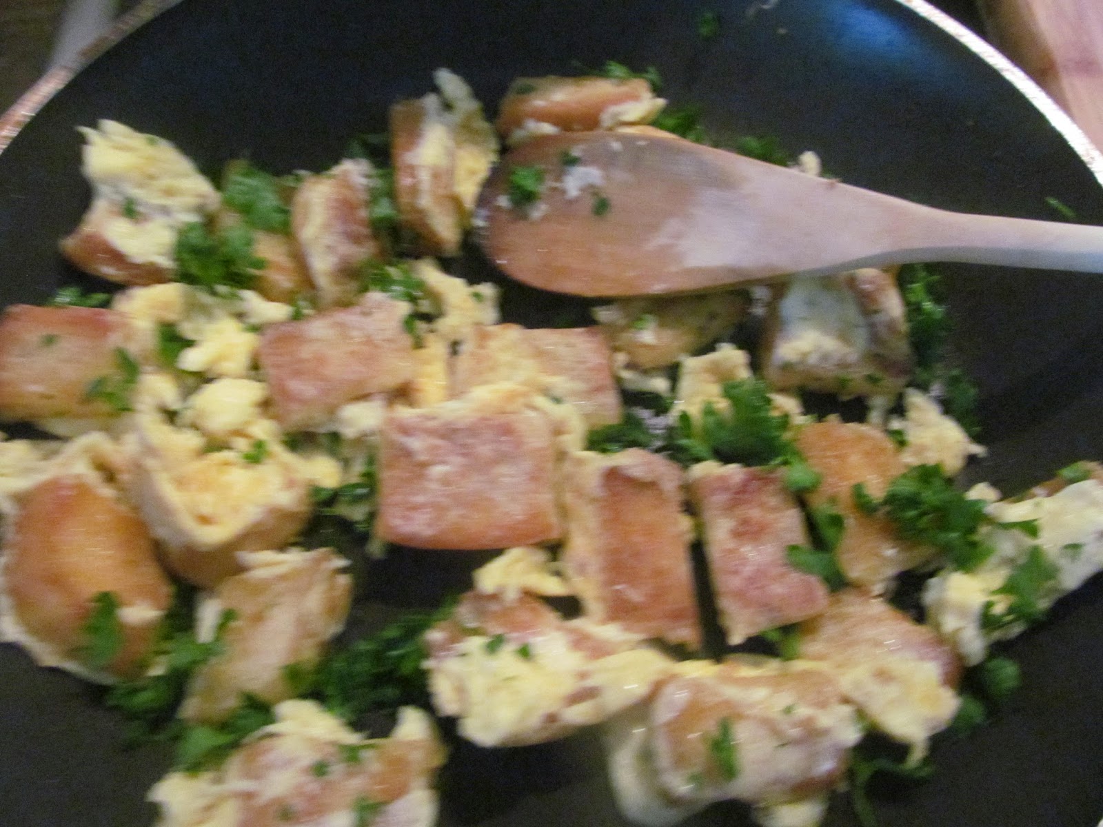 - Към златистите крутони, добавих разбитото яйце и ситно нарязаните листа магданоз и целина. Разбърквах непрекъснато, докато яйцата не се изпържиха също до златисто.