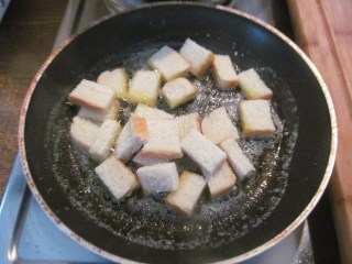 - В подходящ тефлонов тиган разтопих маслото и изпържих до златисто, нарязаните на кубчета филийки хляб.