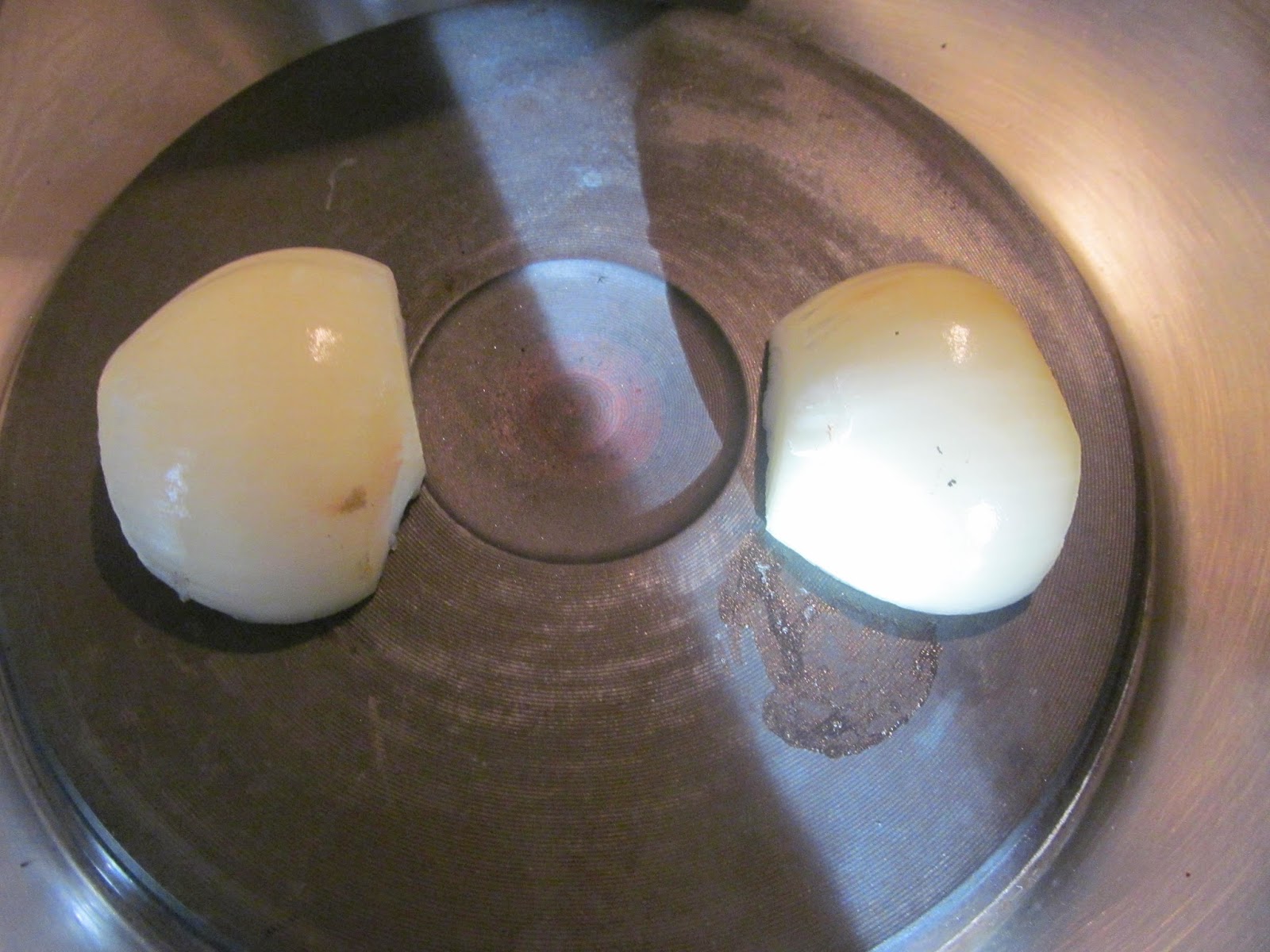- За още по-добър вкус, главата кромид лук обелих, разполових и запекох от всички страни на котлона. След това нарязах на ситно.