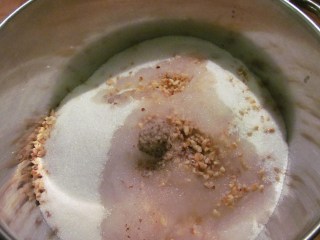 - В подходяща тенджера изсипвам 200 гр. масло, смлените и начуканите лешници, 4 с. л. вода, 2 пак. ванилия и 200 гр. захар.