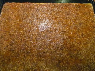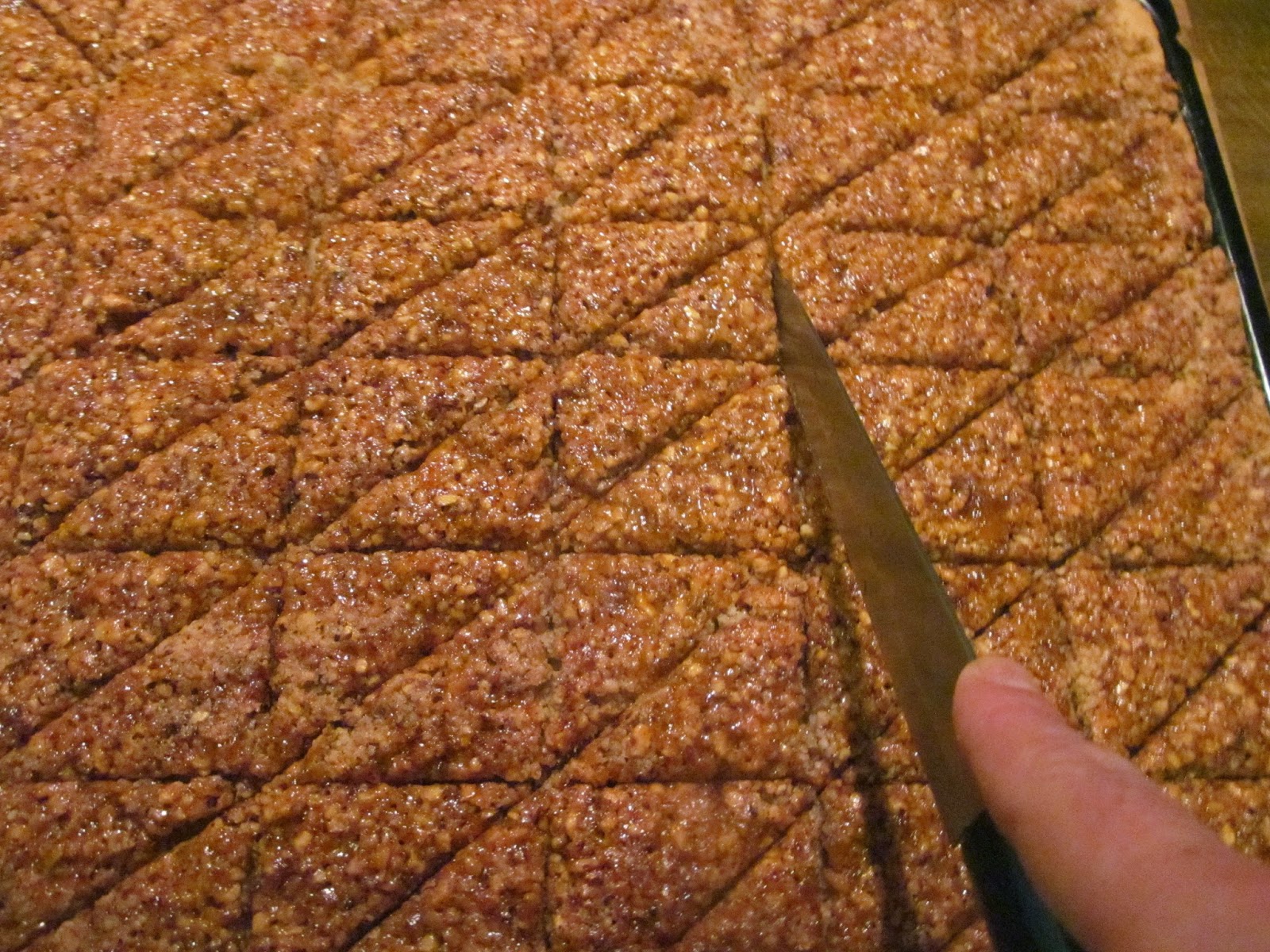 - Още докато е леко топъл, нарязвам с върха на остър нож на малки триъгълничета. Ако сладкишът изстине съвсем, нарязването е трудно. Размерът на лешниковите ъгълчета, определяте Вие сами.