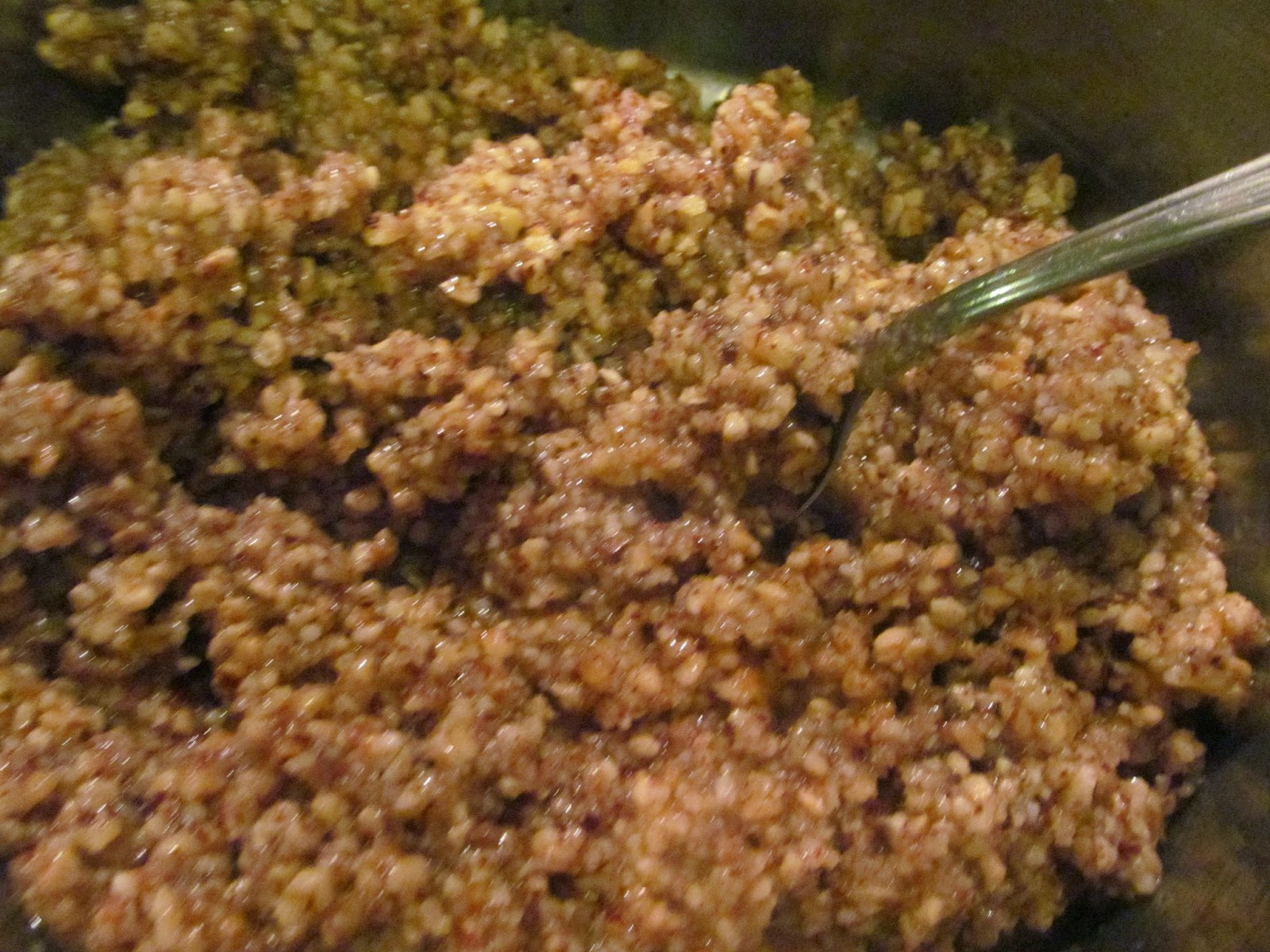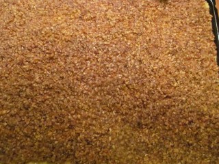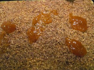- Върху добре разстланата лешникова смес изсипвам 4 с. л. конфитюр от кайсии.