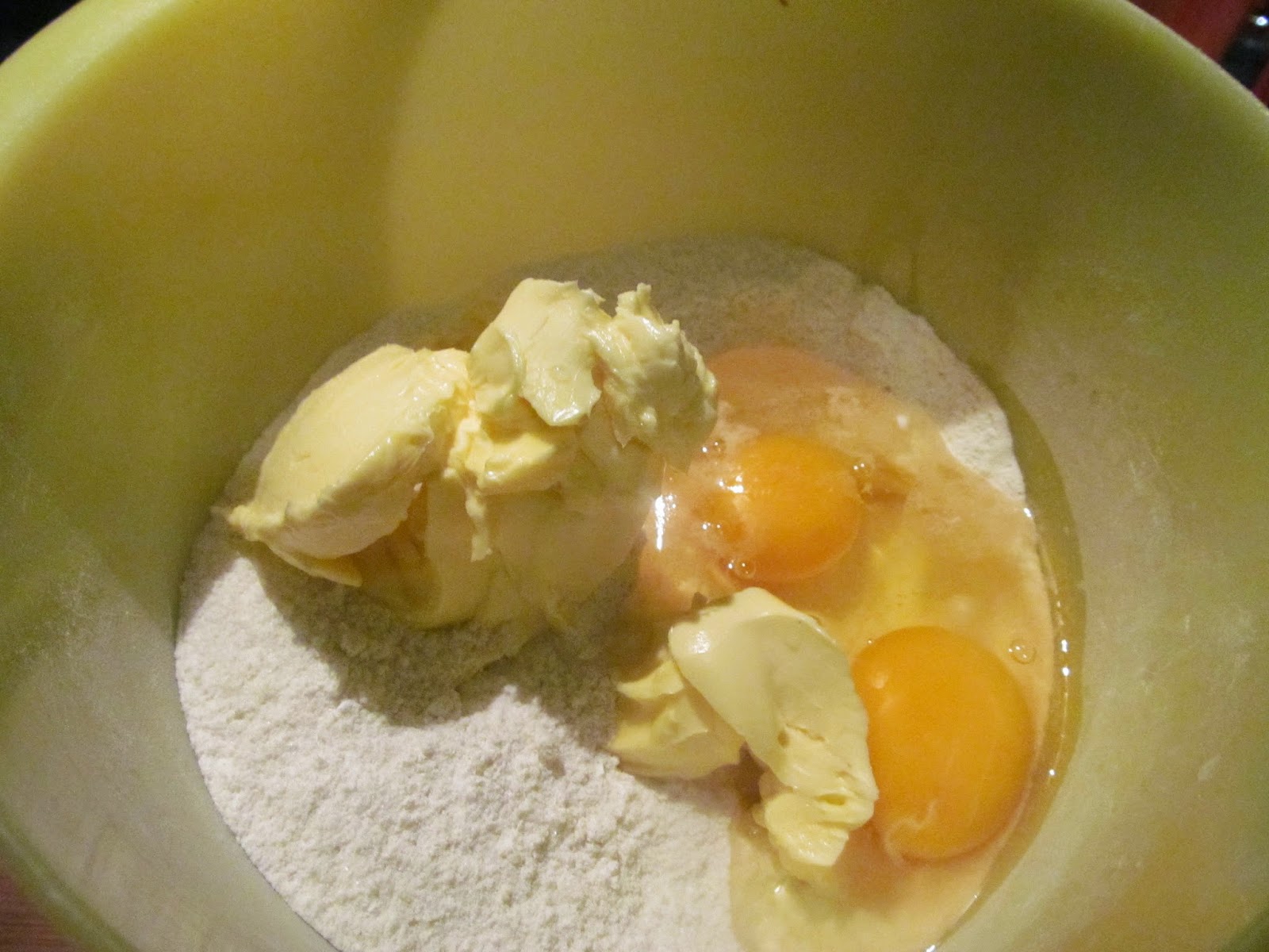 - В купата на миксера изсипвам брашното и бакпулвера. Размесвам ги. Добавям 130 гр. от захарта, 2 пак. ванилия, 2 яйца и 130 гр. маргарин.