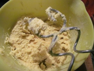 - Разбърквам всичко с миксера, с накрайниците за тесто, докато се получи гладко маслено тесто.