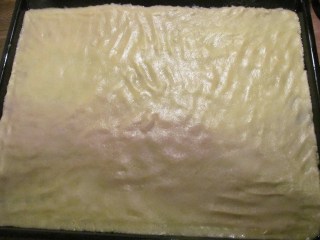 - Готовото тесто разстилам в тавичката на фурната, която предварително съм намазала само с олио. Разстилането е само с пръстите на ръцете, като започвам от средата на тавата и избутвам към стените на тавата.Старая тестото да е равномерно разстлано на всякъде.
