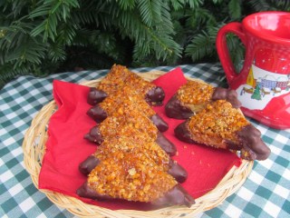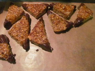 - Потапям две от ъгълчетата на всяко триъгълниче в шоколада. Изчаквам да се изцеди излишното количество и слагам върху хартия за печене да стегне.
