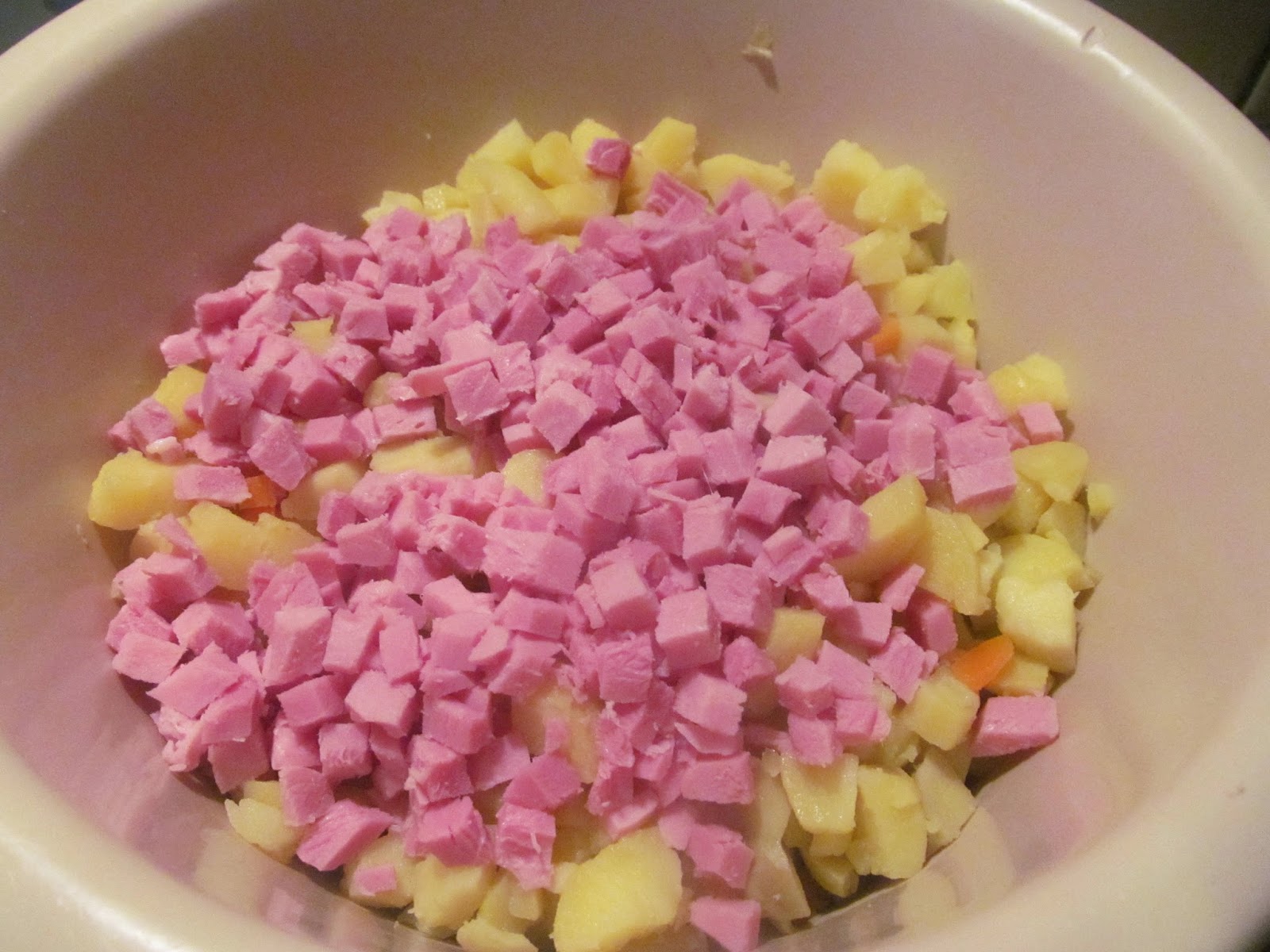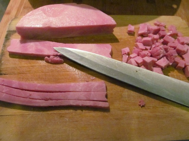 - Хубавото парче шунка, нарязвам на същия размер кубчета.