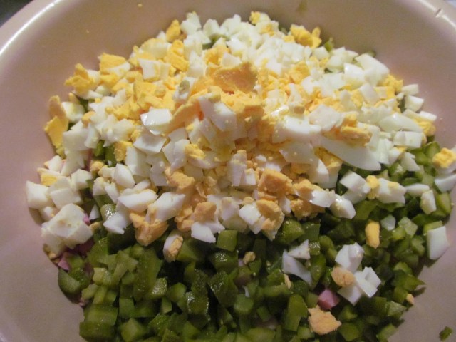 - Сварявам яйцата до твърдо сварени. Аз използвам машинка за варене на яйца, но ако ги варите на котлон, минимум 5 минути. Охлаждам, обелвам и нарязвам на същия размер кубчета.