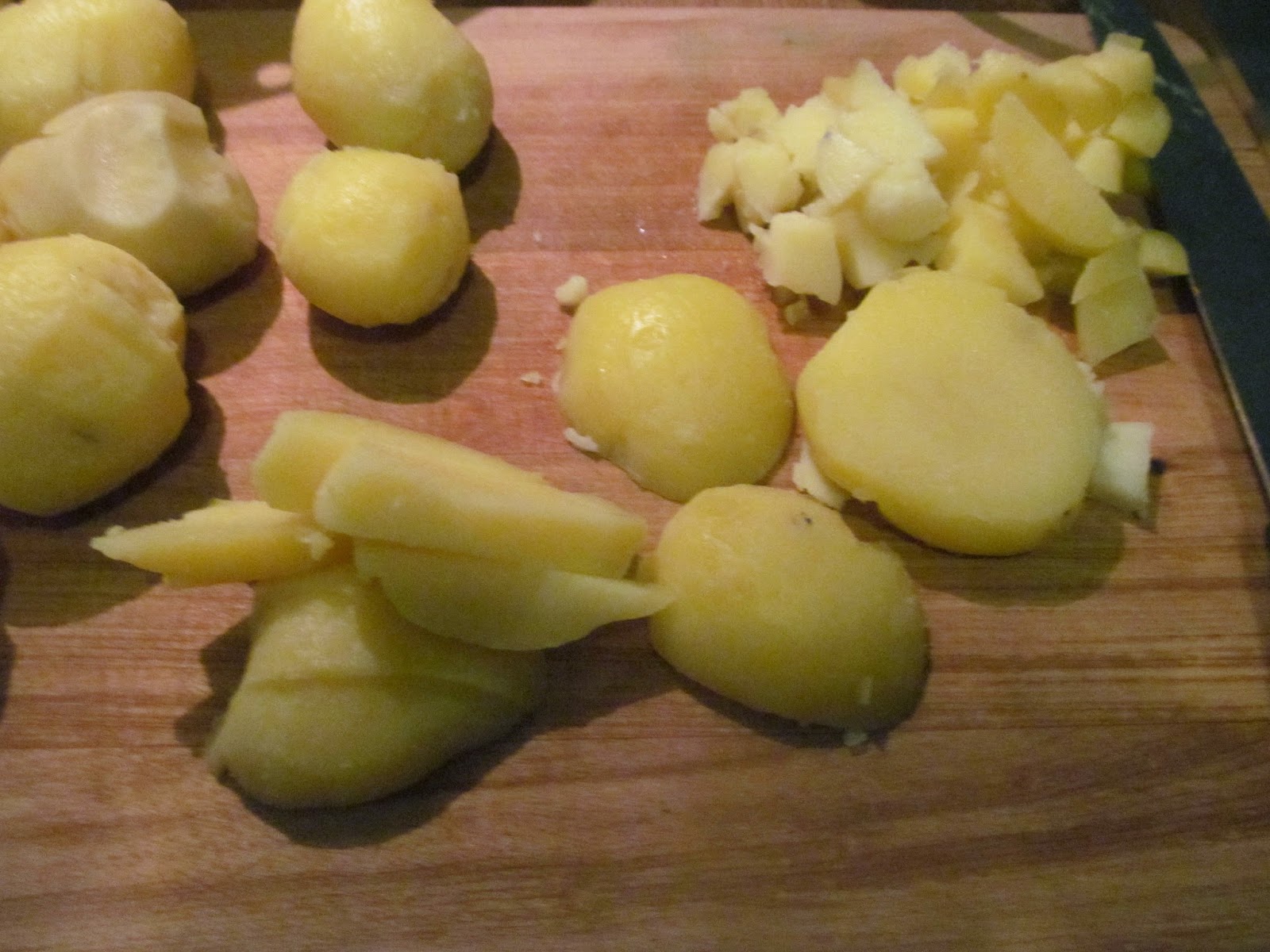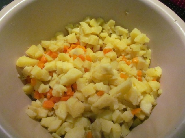 - Отцеждам картофите от водата и когато изстинат, обелвам и нарязвам също на кубчета с размер около 1 см.