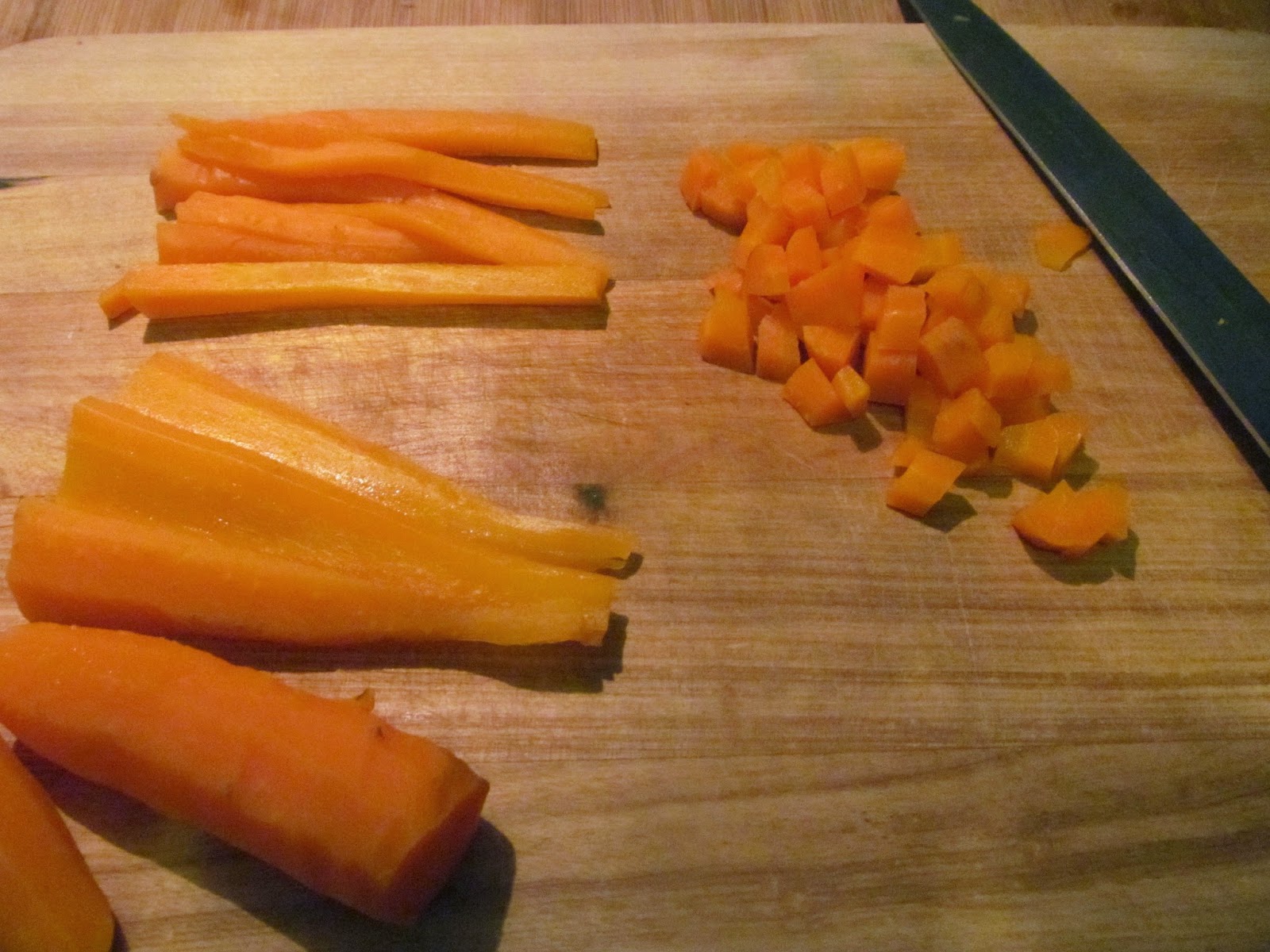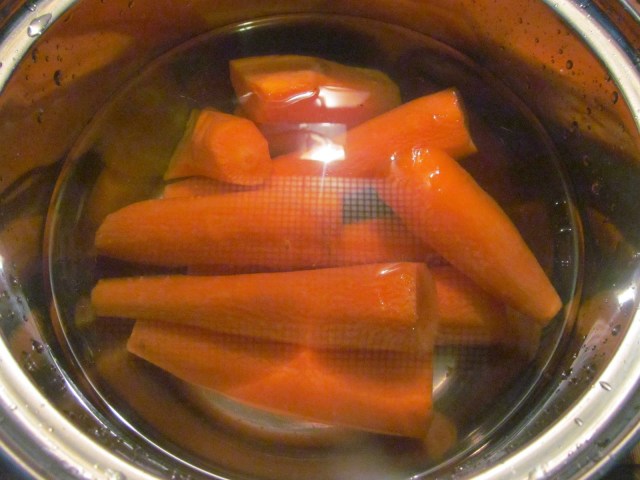 - Измивам и обелвам морковите. Сварявам ги във подсолена вода за минимум 20 минути, или докато омекнат. Прецеждам от водата и изстудявам.