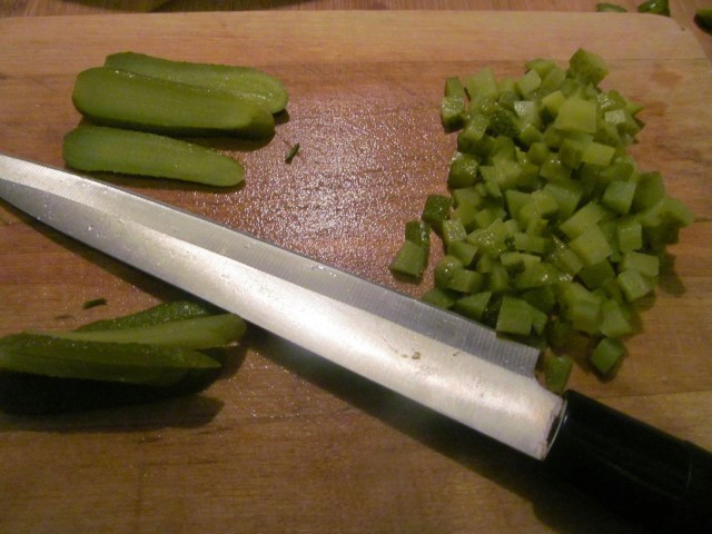 - Краставичките изцеждам добре от маринатата и нарязвам на малки кубчета