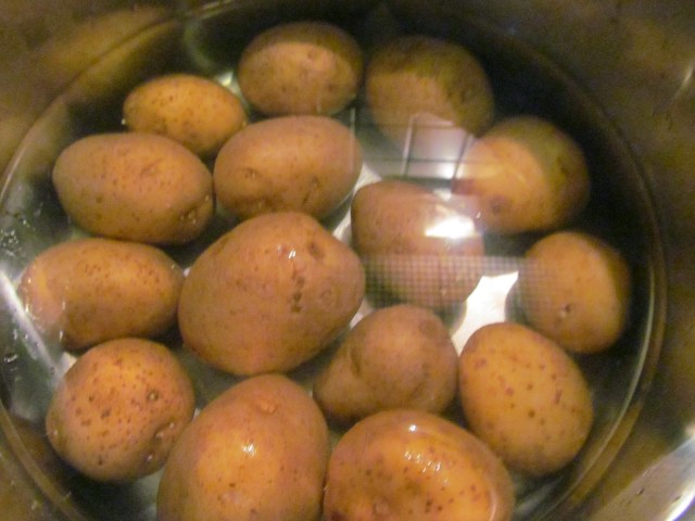 - Измивам картофите и с обелките ги сварявам. Варят се минимум 20 минути или докато вилицата спокойно ги пробожда.