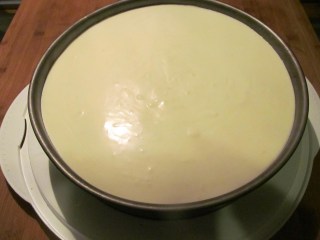 • Изливам крема върху изстиналия блат за торта, който е все още във формата за торта, но съм махнала хартията за печене и измих стените на формата. Така няма въможност да изтече желатиновата смес.