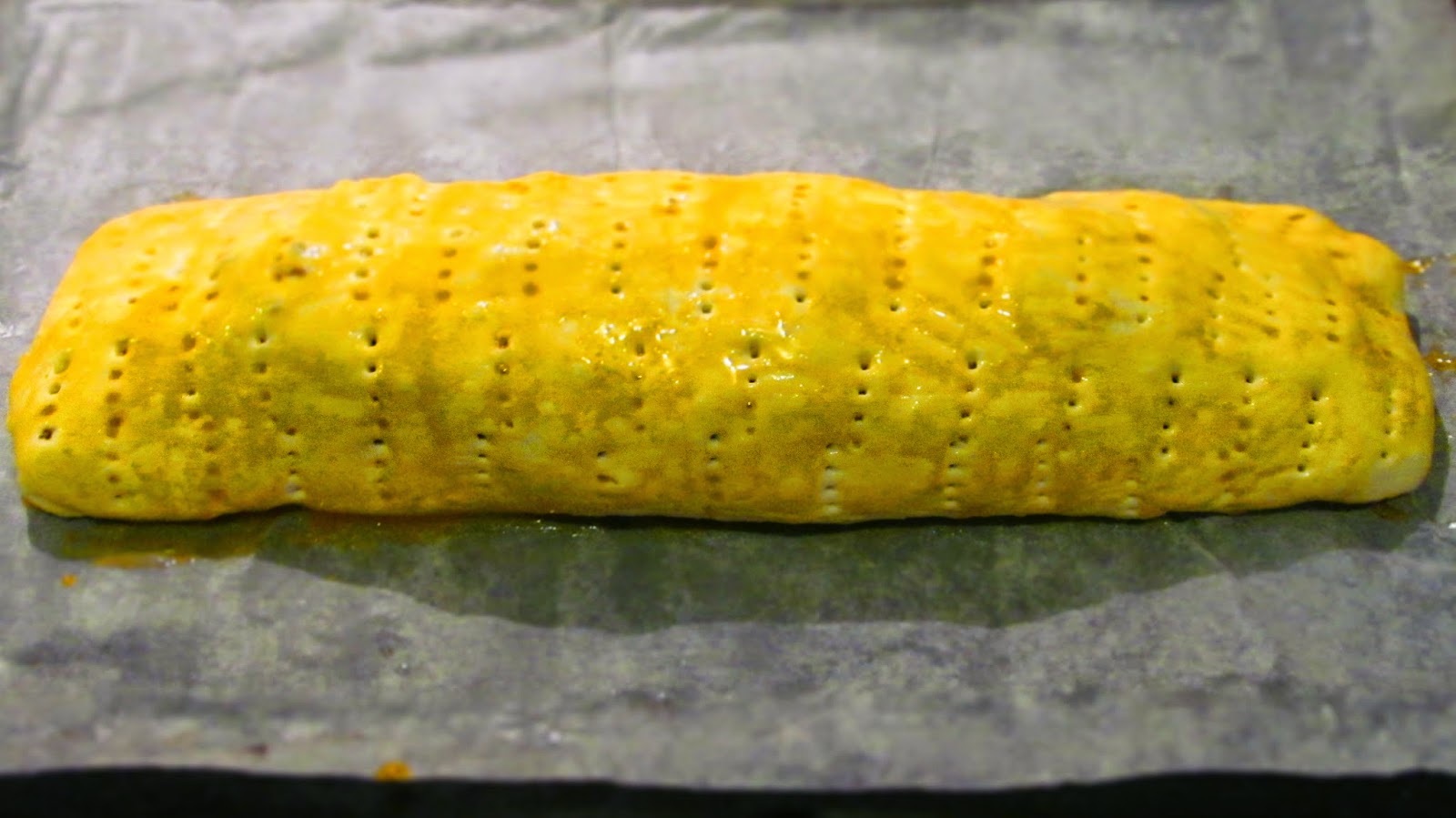 - Намазвам свободните краища с белтък. Така тестото се залепва добре и не се отваря по време на печенето.