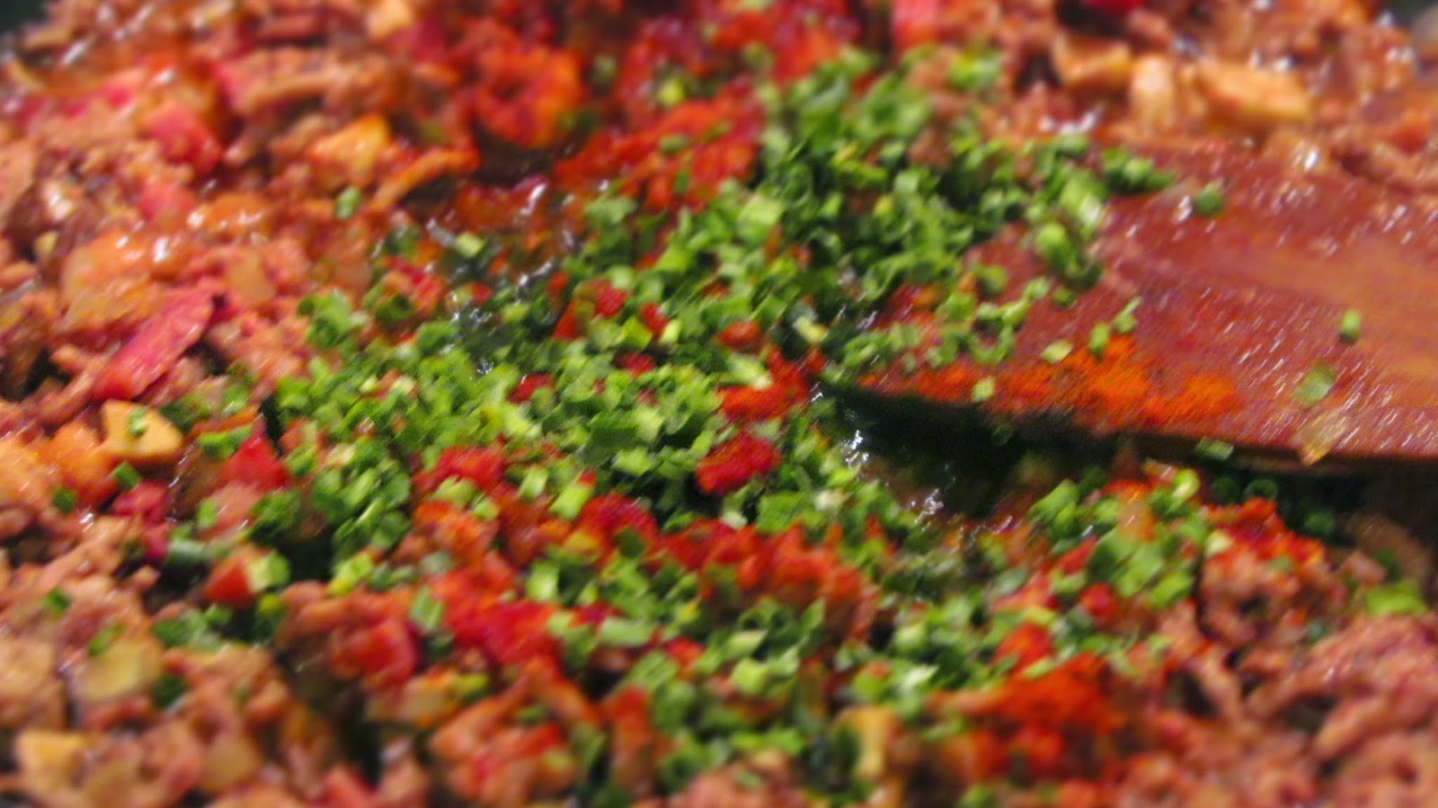 - Към месната смес добавям всички подправки – горчица, сол, черен пипер, червен пипер, табаско, уочестер сос, магданоз.