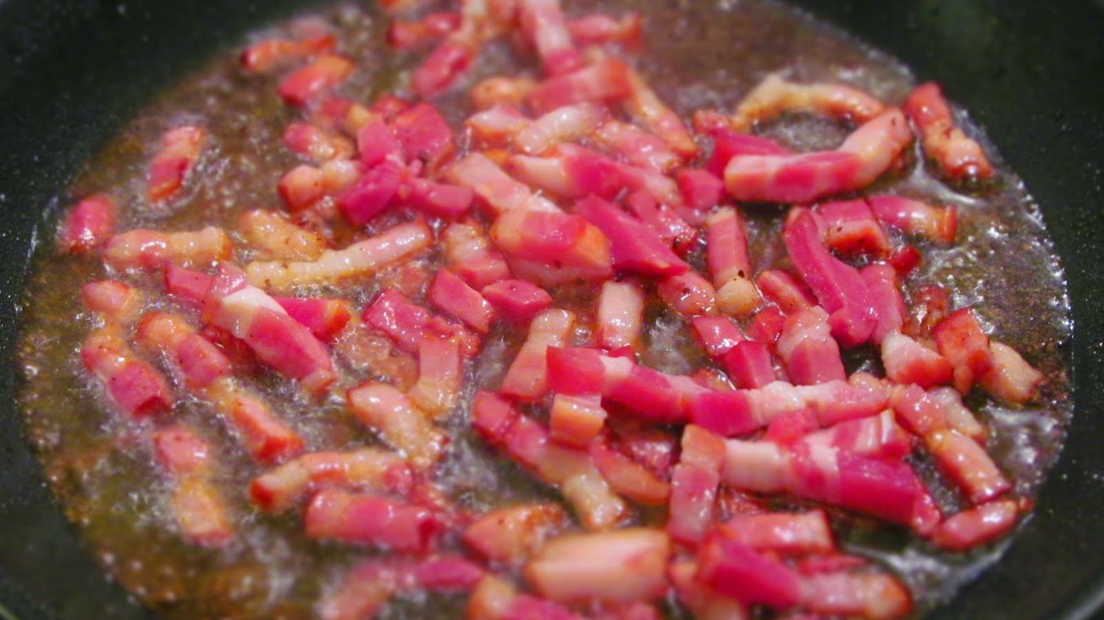 - Към бекона добавям нарязания на малки кубчета кромид лук и запържвам само, докато промени цвета си – до прозрачен.