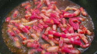 - В същата мазнина изпържвам до златисто бекона, който предварително съм нарязала на тънки лентички.