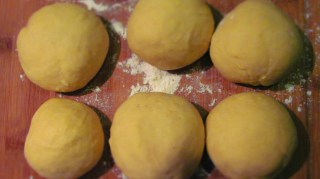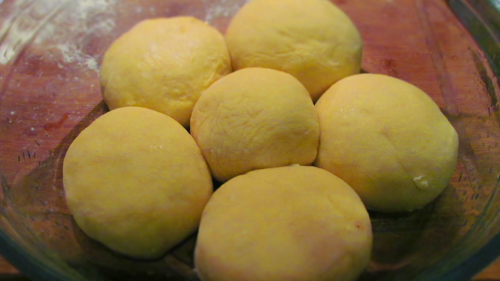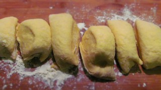 - Върху набрашнена плоскост и с набрашнени ръце оформям втасалото тесто на руло и с помощта на нож, разделям на 6 равни части.