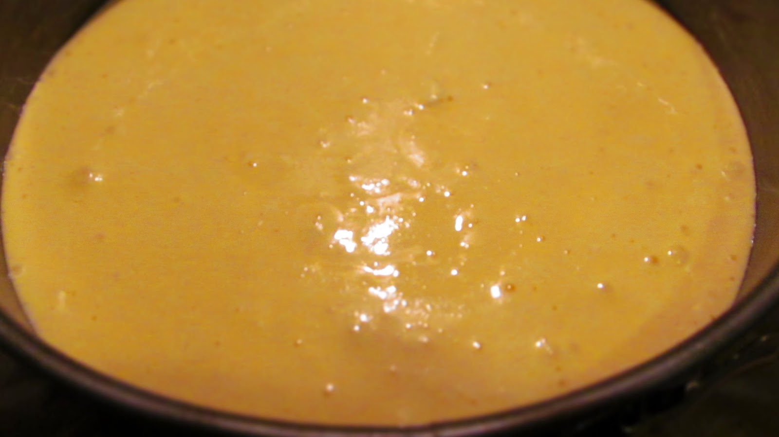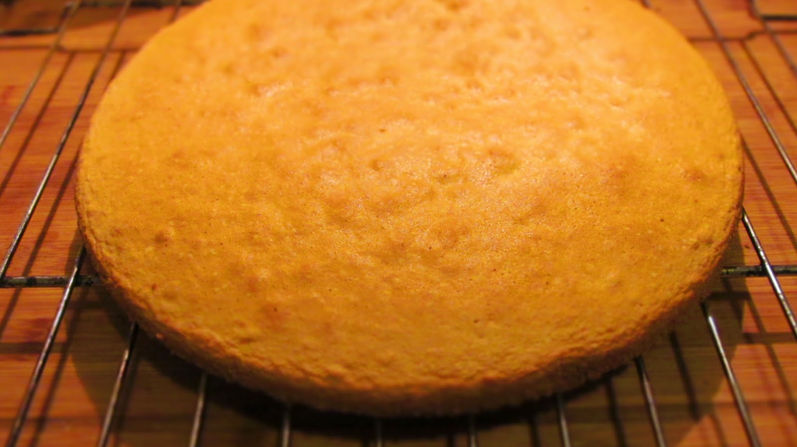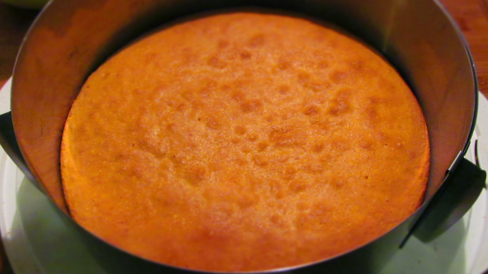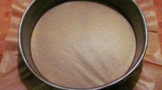 - Изсипвам пандишпановото тесто във формата за торта. Количеството тесто е малко и покрива само около 2 см. от формата, а при печенето не се надига, поради липсата на бакпулвер.