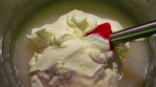 - Добавям разбитата сметана към изстудения вече крем и много бавно и внимателно разбърквам.