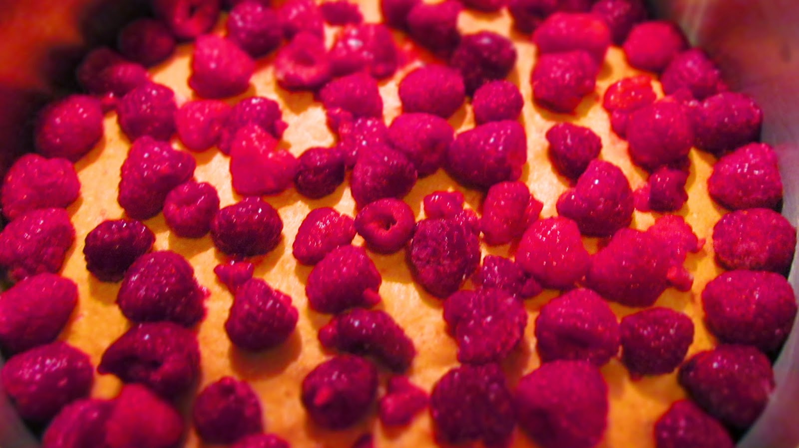 - Подреждам размразените малини върху блата, като се старая по ръба на тортата да са добре подредени, защото ще се виждат, когато сваля ринга.