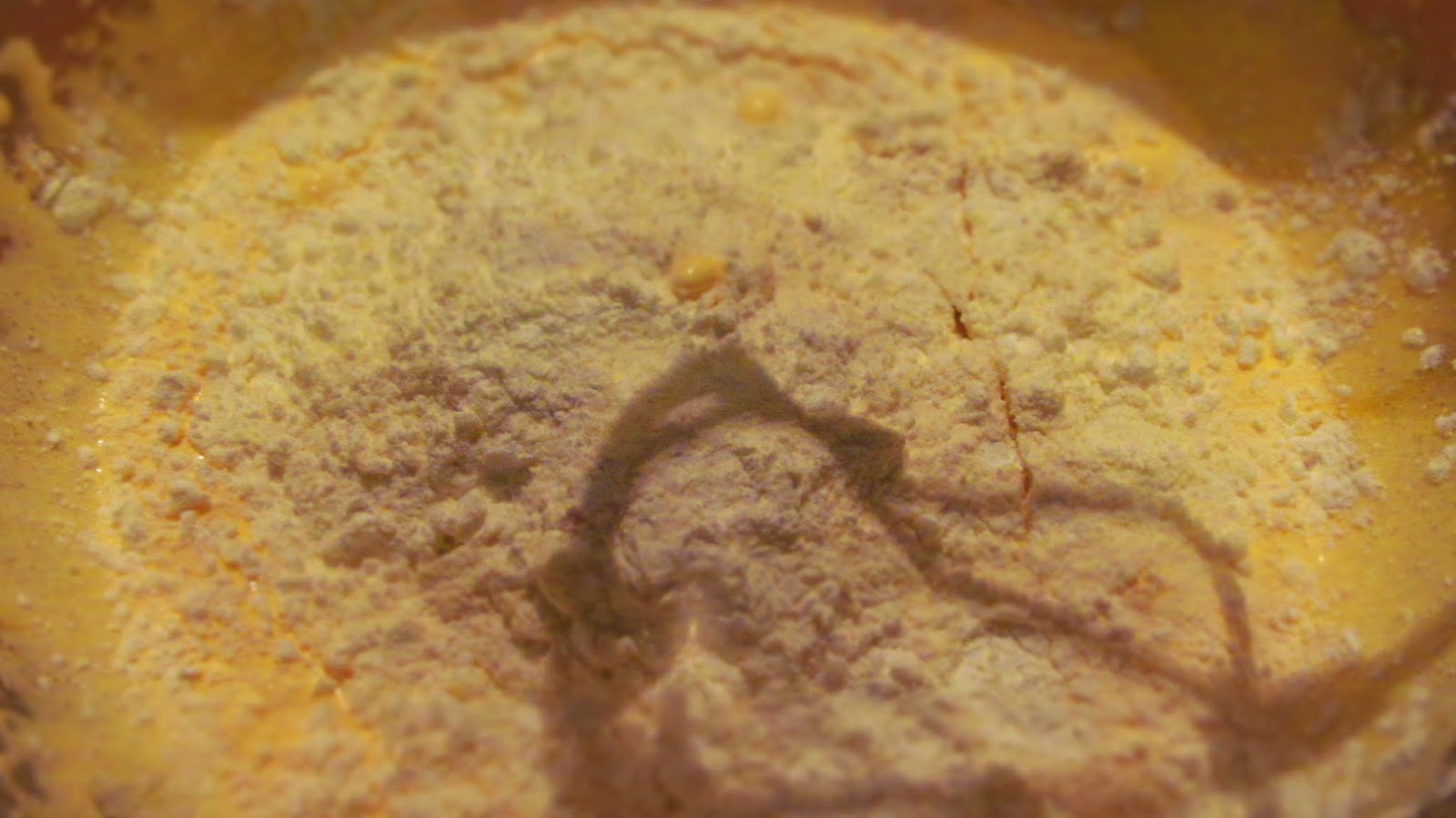 - Добавям брашното, предварително смесено със солта и нишестето, към яйцата и много за кратко разбивам с миксера, или само докато се разбие добре брашното.