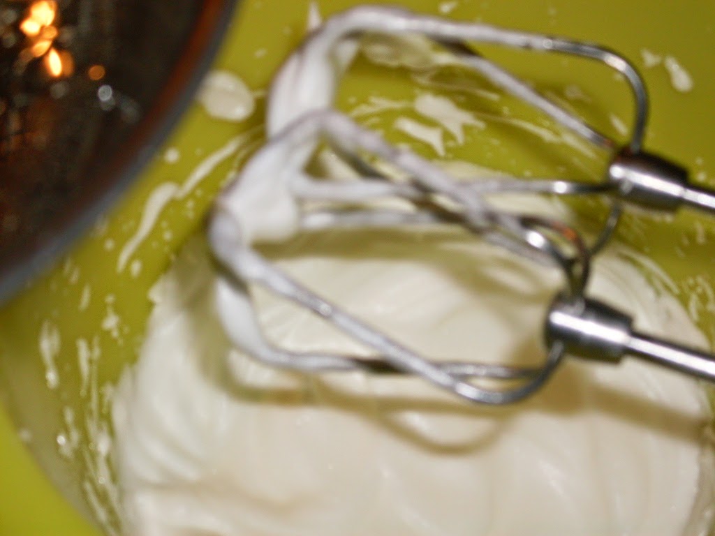 - Разбивам останалите белтъци на плътен сняг с помщта на миксера. Добавям към тях горещия захарен сироп, като не спирам да разбивам.