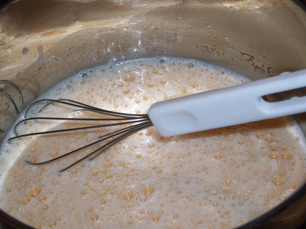 - В подходяща тенджерка разбивам две от яйцата и два жълтъка с 1/2 ч. ч. захар. Прибявам прясното мляко и слагам на котлона само докато сместта заври, като не спирам разбъркването. Малко преди да заври, сместта се сгъстява и се получава гладък крем. Отделям от котлона.