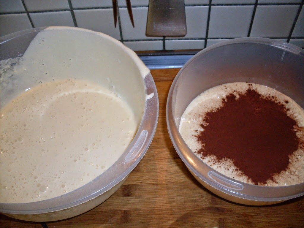 - За да се получат еднакви по големина блатове, разделям бялото тесто в две еднакви купички. Същото правя и с кафявото тесто.
