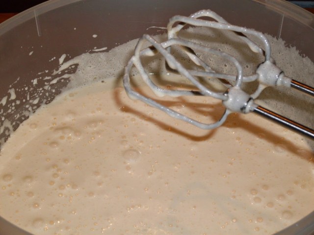 - Разбивам яйцата и захарта, с помощта на миксер, до побеляване и не по-малко от 5 минути.