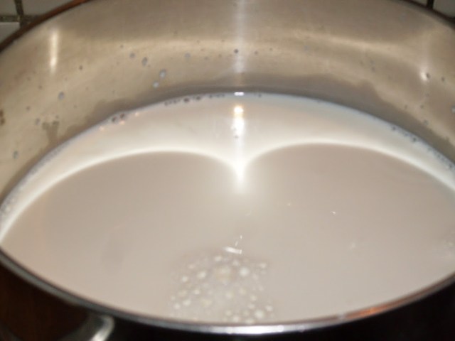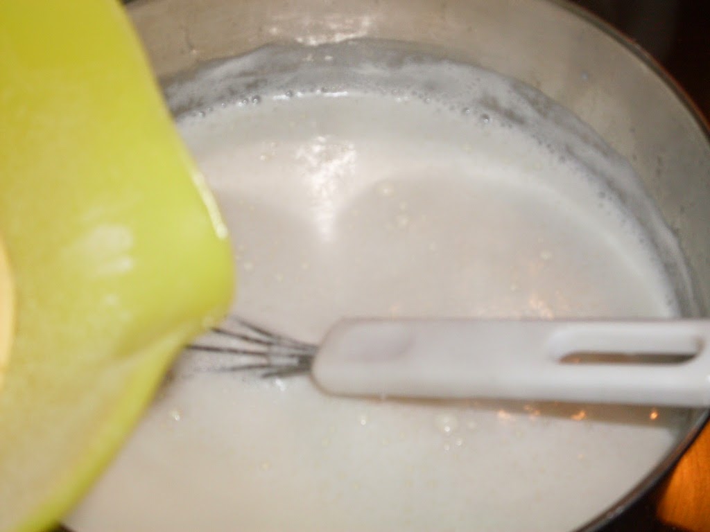- Слагам тенджерата с млякото на студен котлон и тогава включвам, като на тънка струйка, при непрекъснато бъркане, изсипвам кашата.