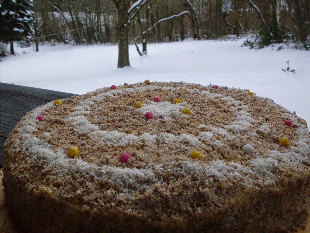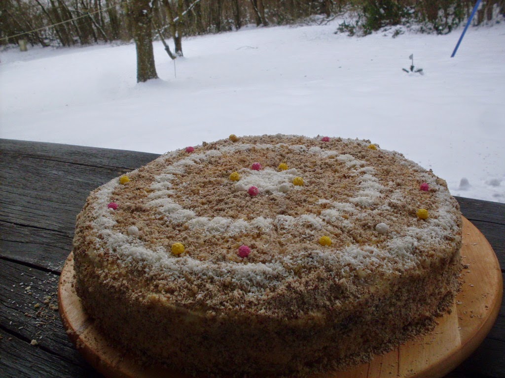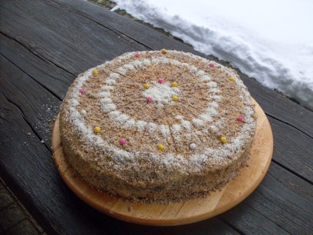 Освен, че я приготвих по технологията на бабите /изключение прави само използването на миксер/, спазих и пропорциите, и тавичката. Резултатът – огромна бабешка торта! Огромна, като за огромна компания, но много обикновена и декорирана обилно със смлени орехови ядки, и най-важното – много вкусна, точно като преди 40 години.