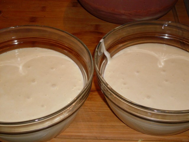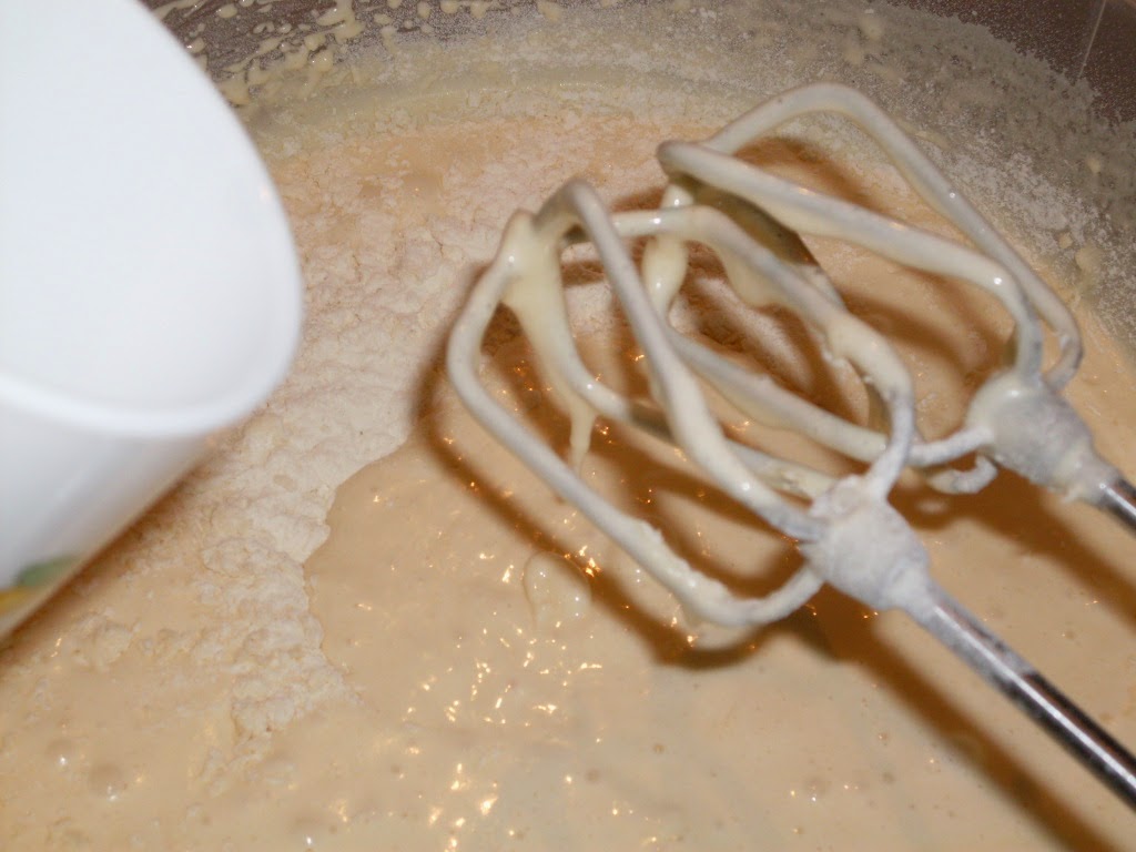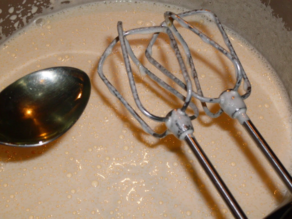 - С помощта на миксер, разбивам яйцата за крема и добавям брашното към тях. Получава се гъста каша /като за палачинки/