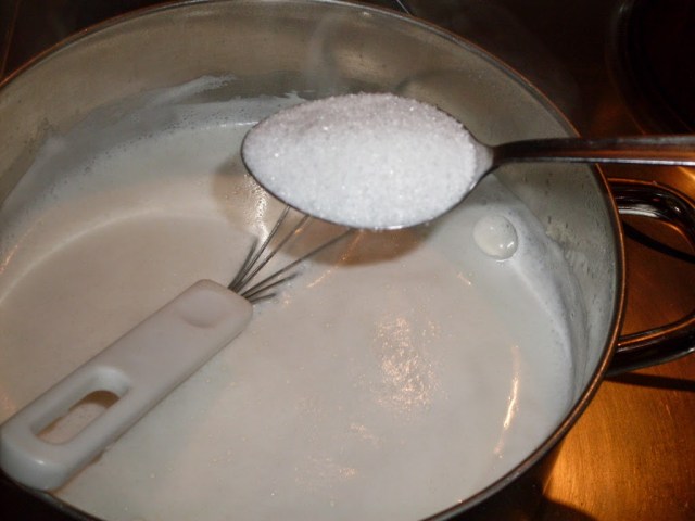 - Дърпам млякото от горещия котлон и добавям захарта. Разбърквам до разтопяването й.